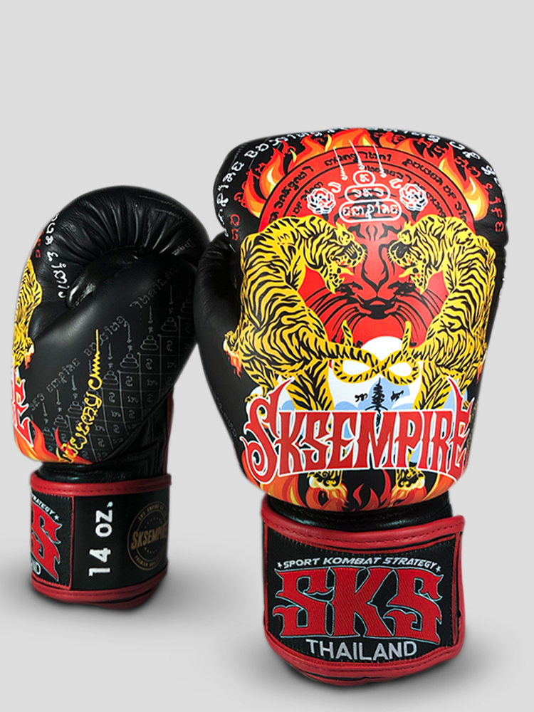 SKS Velcro Boxing Gloves It is a combination of the Thai tattoo pattern that is a tiger. which is one of the talisman that conveys great power, has been combined with the use of modern patterns to add beauty And use fire patterns to add to show the fierce heat.